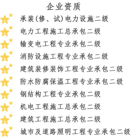 金楓電力集團有限公司,成立于2015年5月28日,注冊資金6060萬元,是一家專業(yè)從事電力工程施工的集團化公司。公司經(jīng)營范圍包括:電氣安裝服務(wù);建設(shè)工程施工;輸電、供電、受電電力設(shè)施的安裝、維修和試驗;測繪服務(wù);建筑勞務(wù)分包;建筑工程設(shè)計;發(fā)電機及發(fā)電機組制造;建筑工程機械與設(shè)備租賃;工業(yè)工程設(shè)計服務(wù);技術(shù)服務(wù)、技術(shù)開發(fā)、技術(shù)咨詢、技術(shù)交流、技術(shù)轉(zhuǎn)讓、技術(shù)推廣等。公司持有國家能源局頒發(fā)的承裝(修、試)電力設(shè)施許可證,承裝類二級、承修類二級、承試類二級資質(zhì);電力工程施工總承包二級資質(zhì);輸變電工程專業(yè)承包二級資質(zhì);建筑裝修裝飾工程專業(yè)承包二級資質(zhì);消防設(shè)施工程專業(yè)承包二級資質(zhì);防水防腐保溫工程專業(yè)承包二級資質(zhì);施工勞務(wù)資質(zhì);機電工程施工總承包二級;建筑工程施工總承包二級;城市及道路照明工程專業(yè)承包二級;鋼結(jié)構(gòu)工程專業(yè)承包二級資質(zhì);公司已通過質(zhì)量管理體系認證、環(huán)境管理體系認證及職業(yè)健康安全管理體系認證。并獲得省級信用評價AAA證書;連續(xù)多年納稅信用評價A級。
